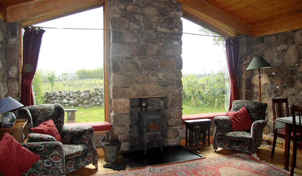From the living-room, through the wall-to-ceiling windows in the gable end can be seen a range of mountains, magnificent in all seasons.